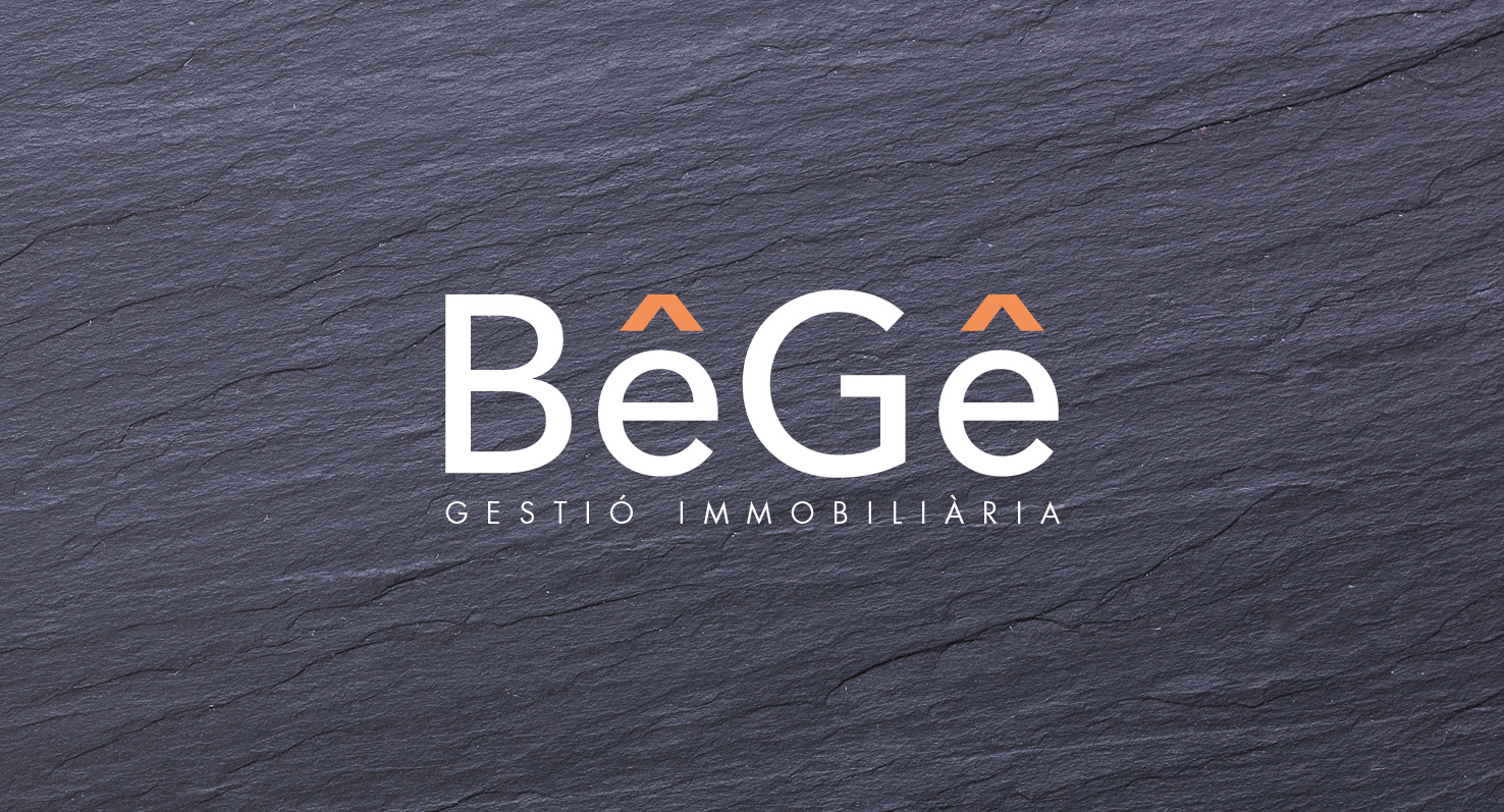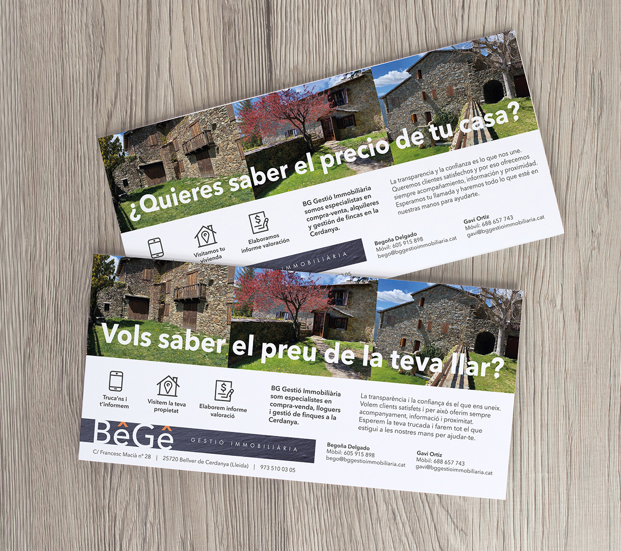 Disseny d'imatge corporativa d'immobiliària de la Cerdanya. Logotip inspirat en la textura de la llosa i de la teula, i amb les lletres que es pronuncien les inicials BG en català. Flyer, nadala, tagetes i merchandising.